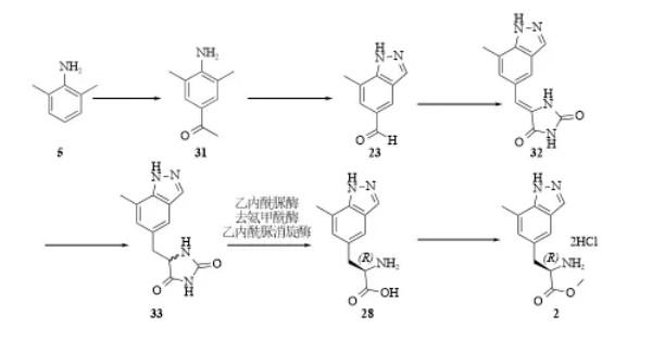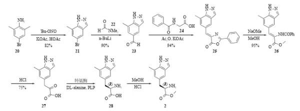 路线四:原研公司报道了通过转氨酶构建氨基手性中心的路线[6,7],以化合物20为原料,先同亚硝酸叔丁酯反应构建吲唑环,然后通过卤素金属交换、Erlenmeyer–Plöchl、开环、水解、转氨酶催化、甲酯化反应得到中间体2(图7)。