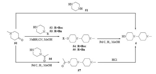 以N甲基哌啶酮为起始原料,经1步或2步反应得到中间体4[14-17](图13)。
